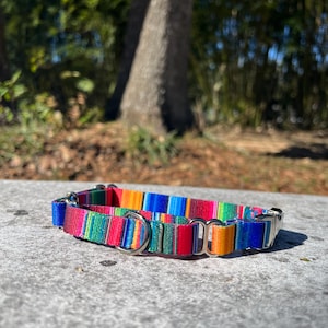 Your dog will look good, stay safe, and have fun with this blue and green striped martingale collar. The martingale design is a safer option for dogs that slip out of standard collars.