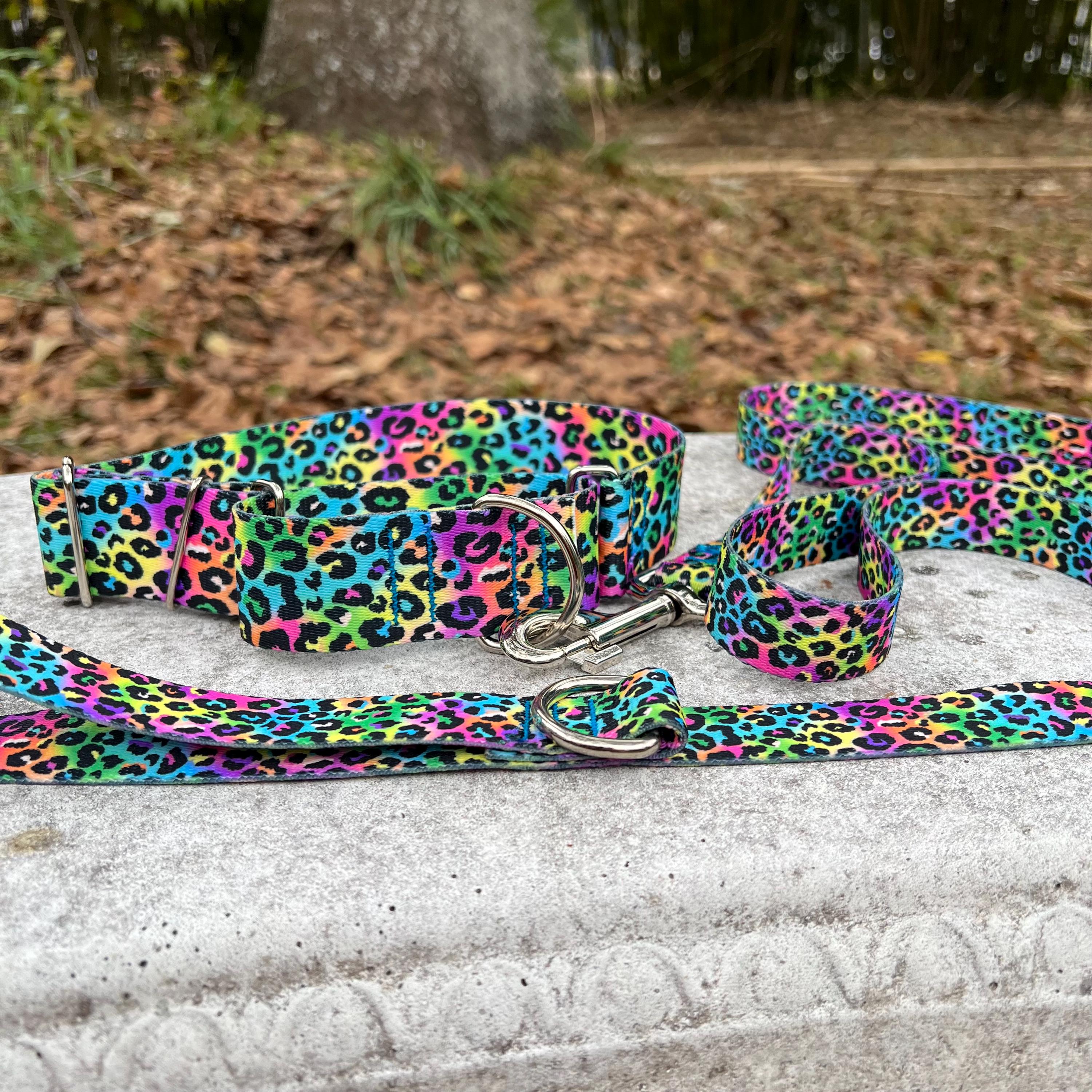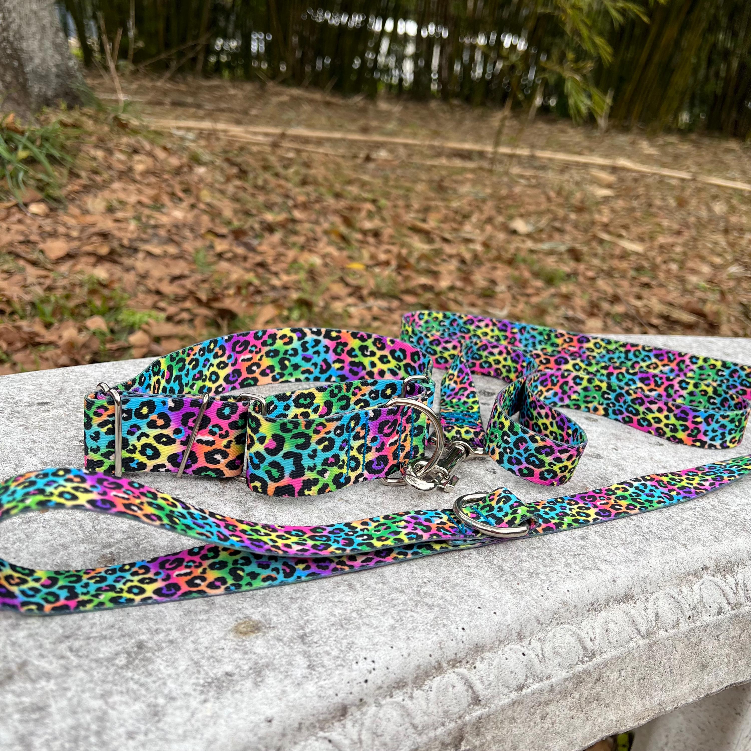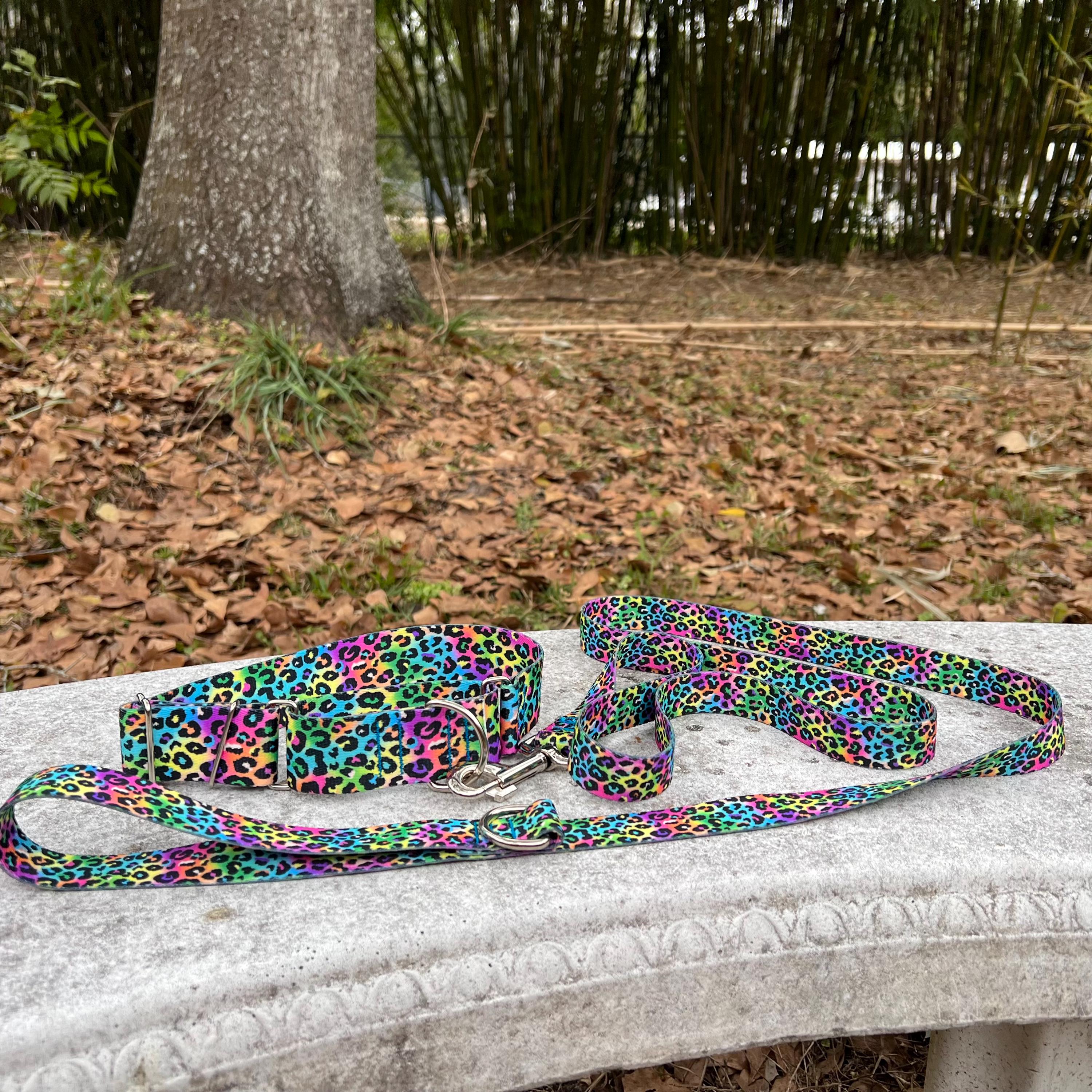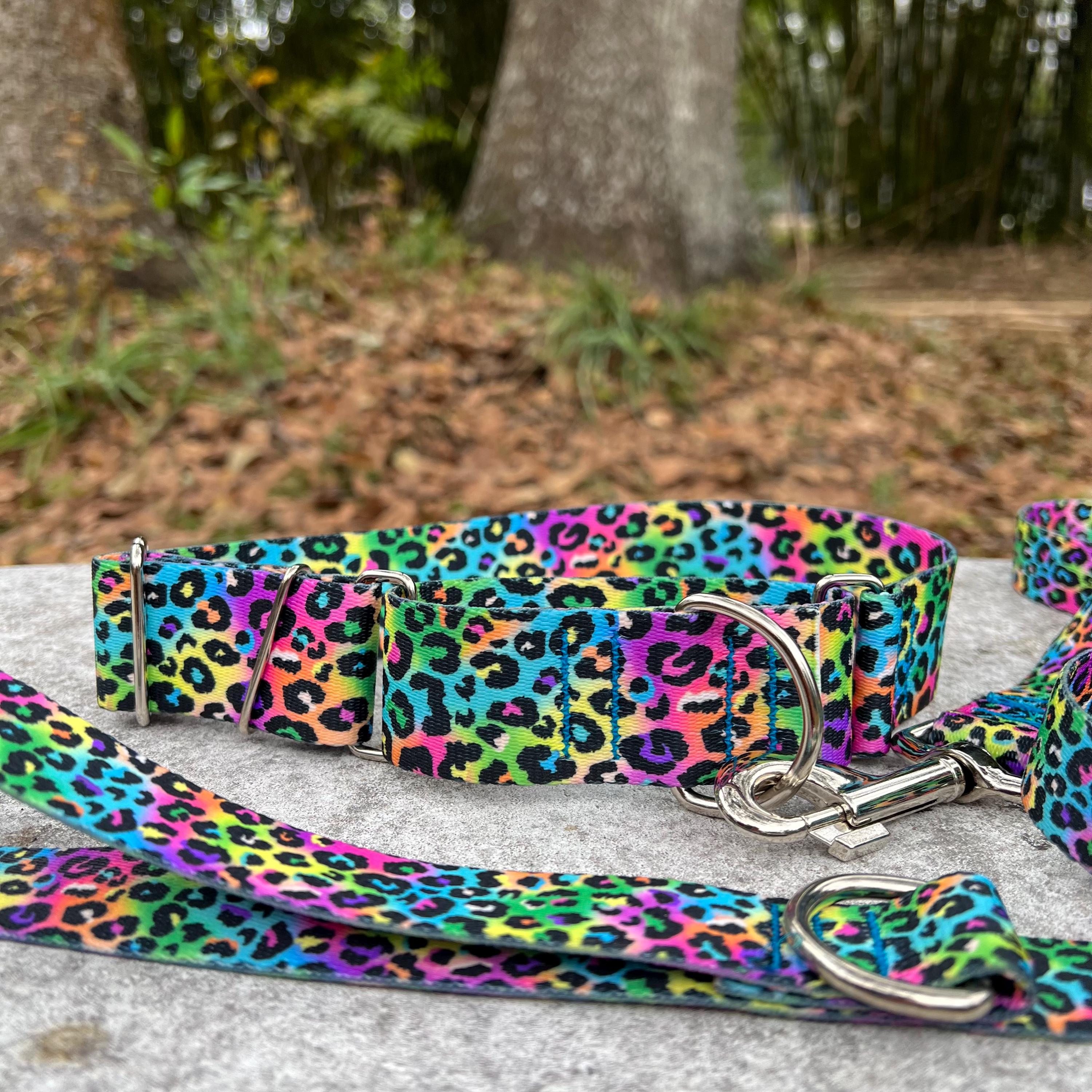 Neon Rainbow Leopard Print 1.5 inch Martingale Dog Collar and Leash Set: USA Made, Durable Polyester