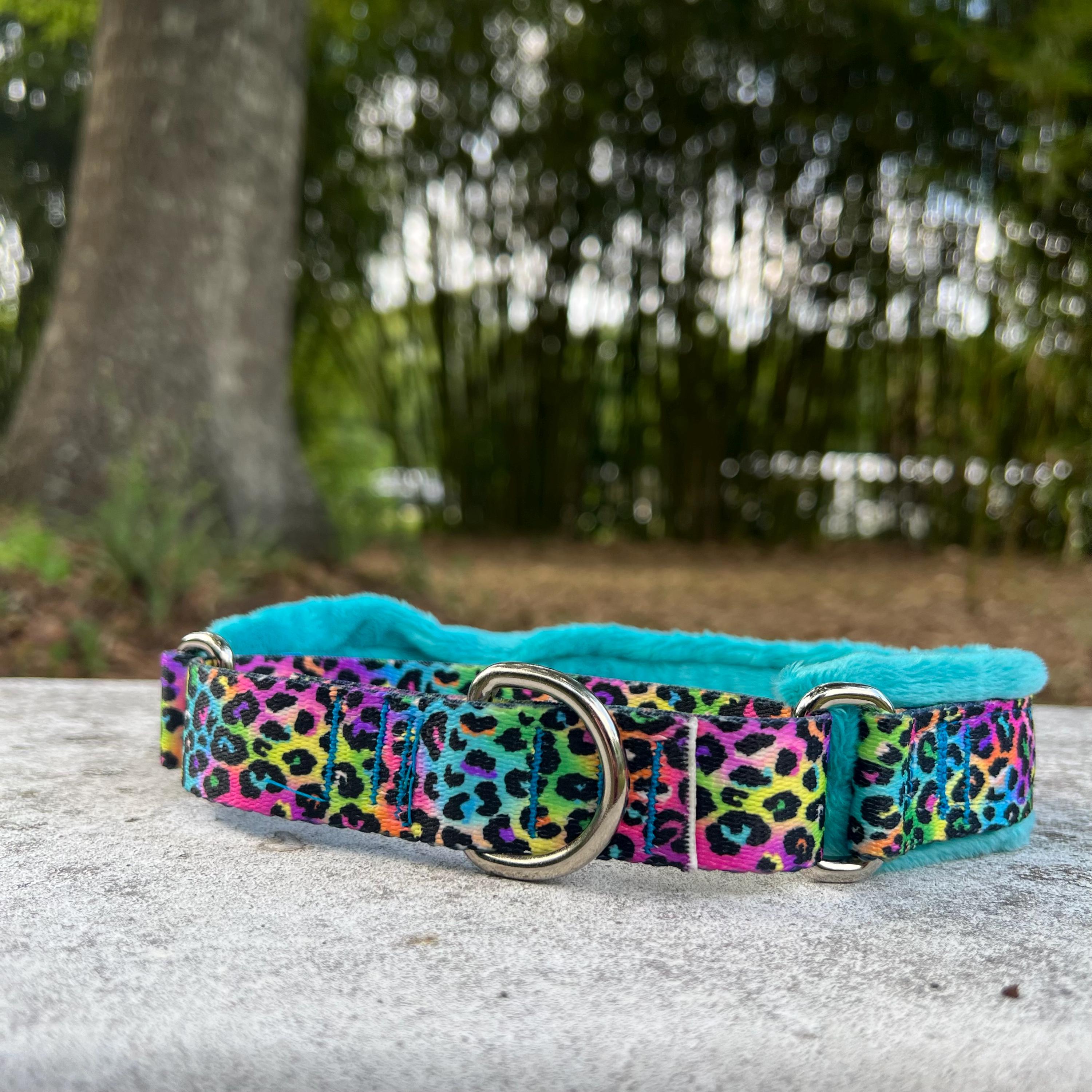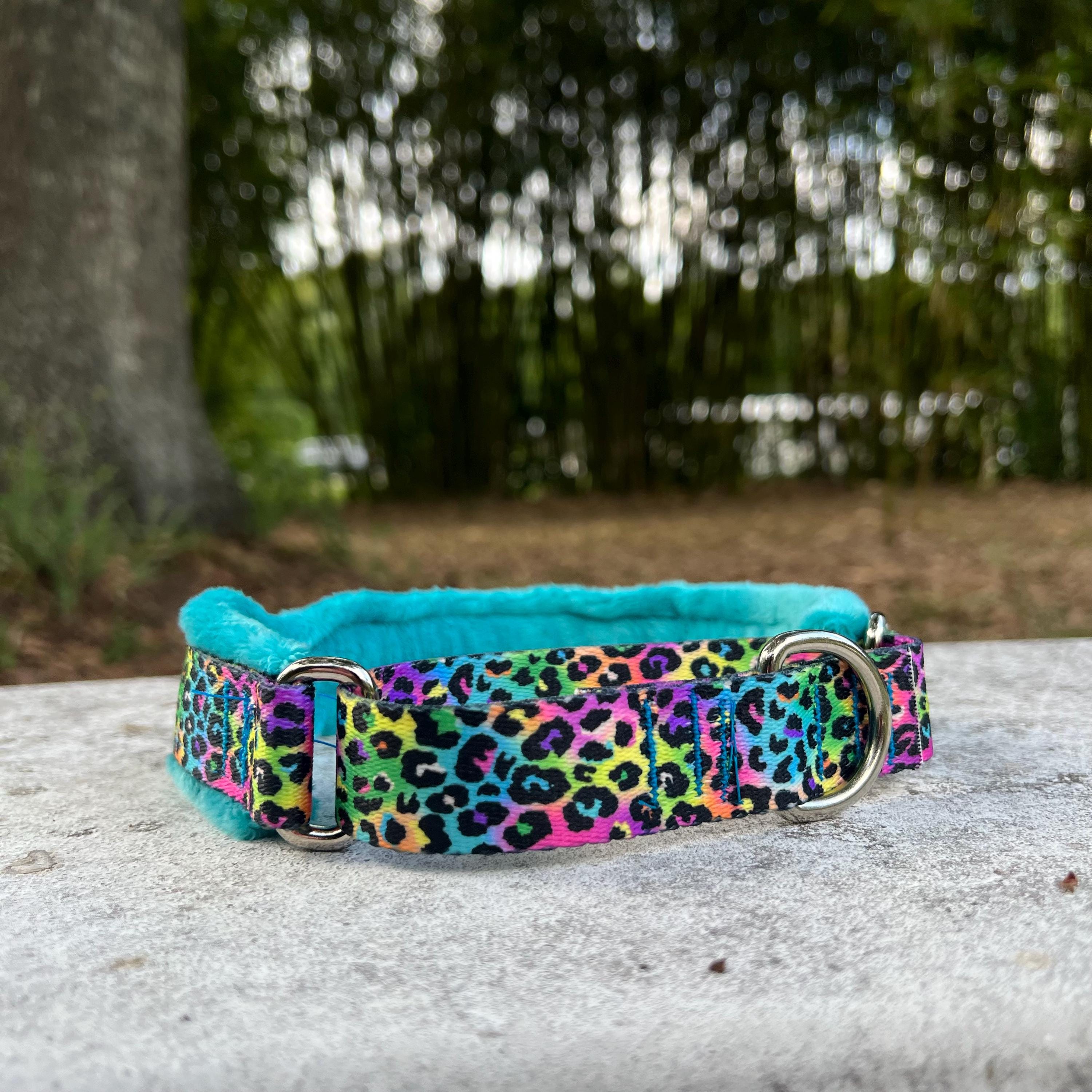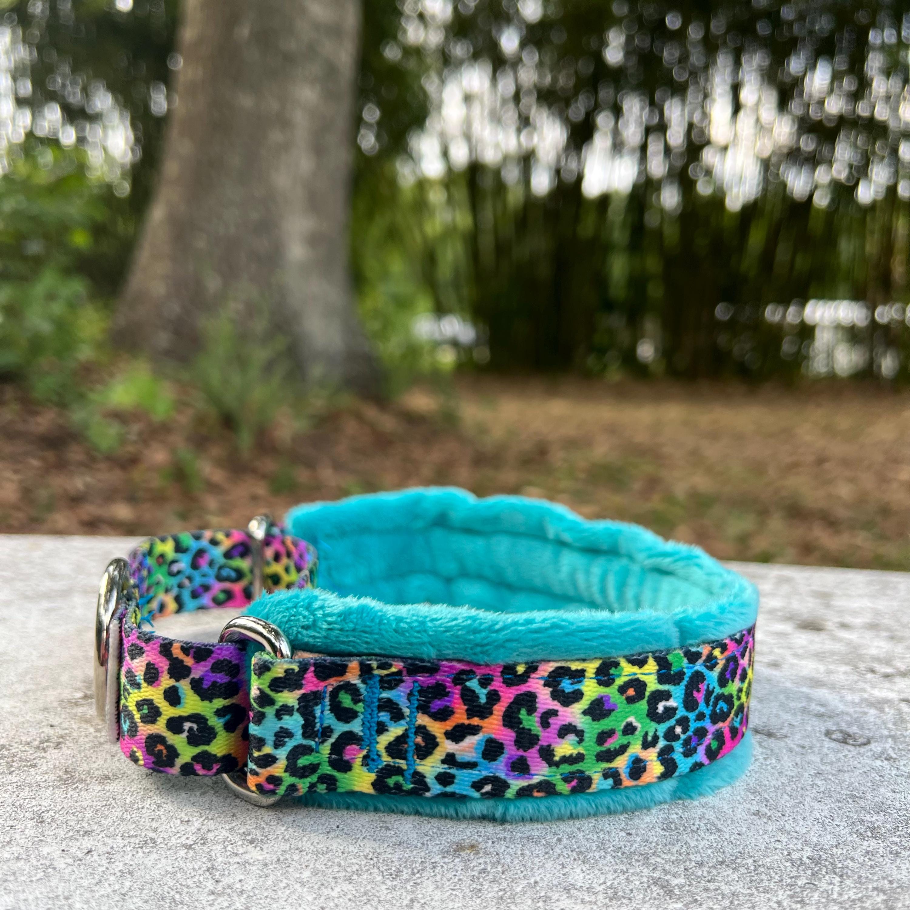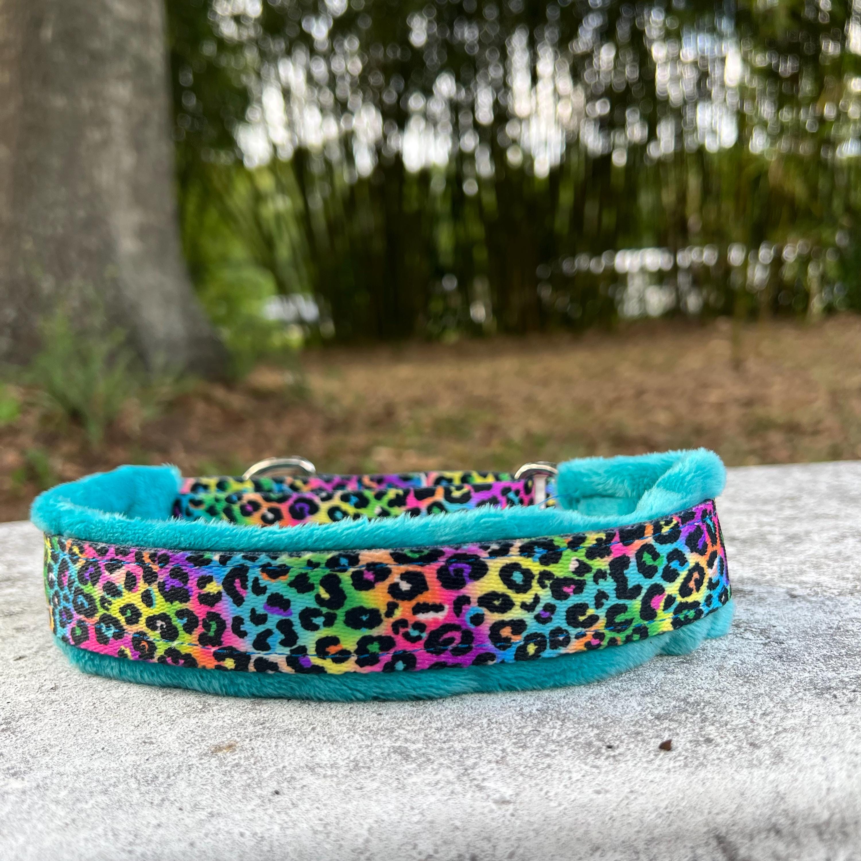 This colorful neon leopard print collar is a match for our other neon leopard print collars and leashes. This collar is made with 1" wide webbing and is padded with soft minky fleece in aqua.